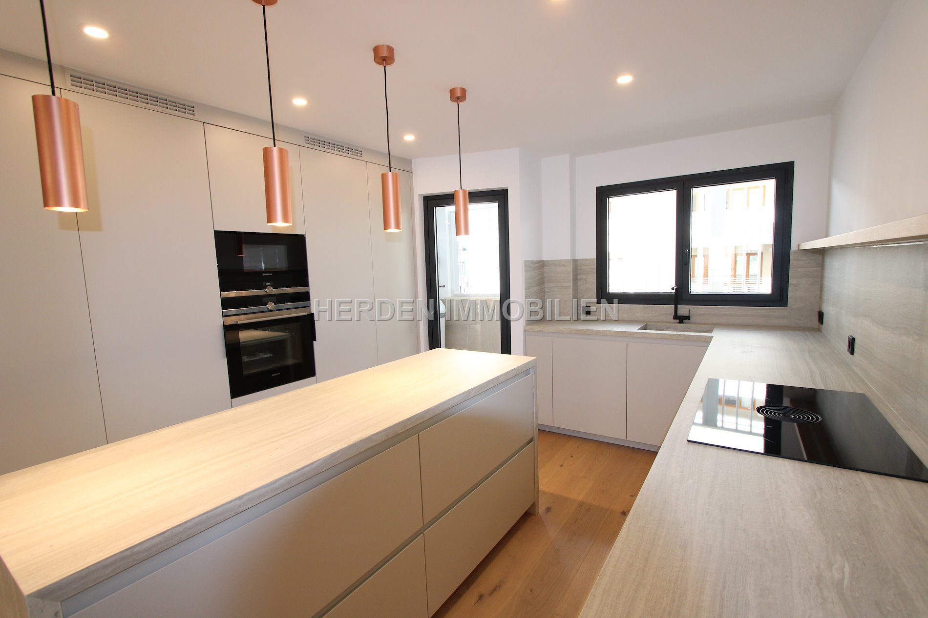 Die hochwertige Designer-Einbauküche ist mit Siemens-Geräten, einem BORA-Ceranfeld, edlen Naturstein-Arbeitsflächen aus Travertin sowie einem spektakulären Weinkühlschrank ausgestattet – ein Highlight für Genießer.